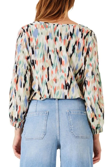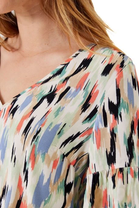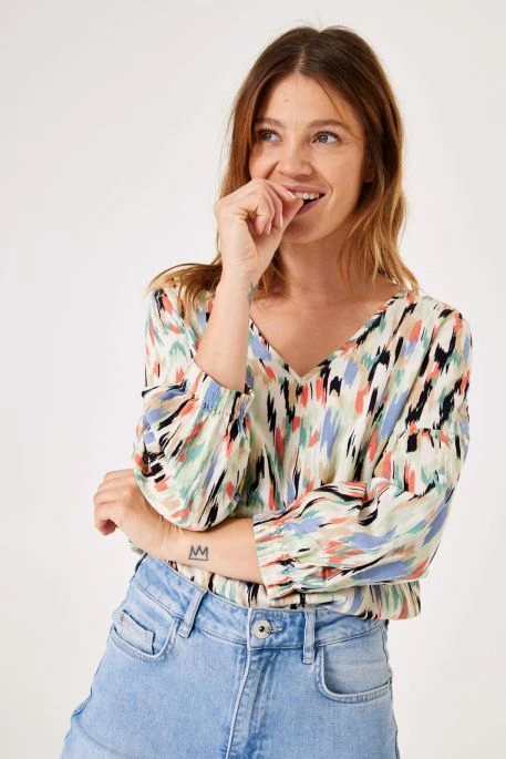 Chemisier Garcia Coloré pour femme. Chemisier à manches extra larges longues avec poignet élastiqué, coupe classique, col en V. Tissu intégralement imprimé.