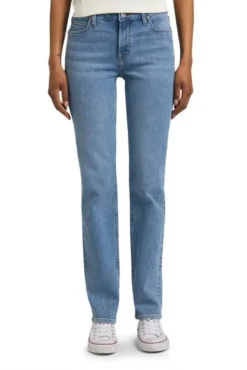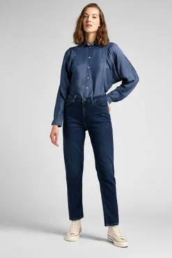 Jean Lee Carol pour femme. Jean taille haute, coupe droite de la cuisse à la cheville, coupe courte (au dessus de la cheville). Fermeture par bouton et braguette zippée.