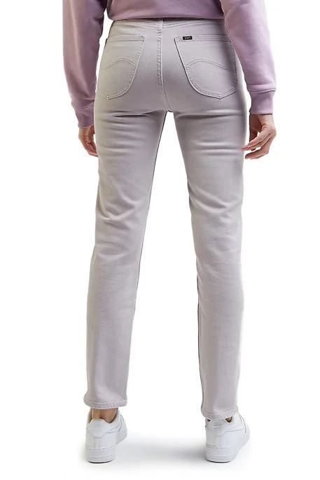 Jean Lee Carol pour femme. Jean taille haute, coupe droite de la cuisse à la cheville. Fermeture par bouton et braguette zippée. Modèle 5 poches.