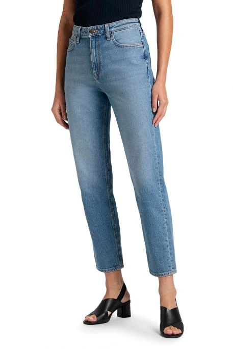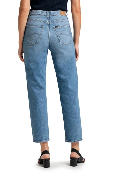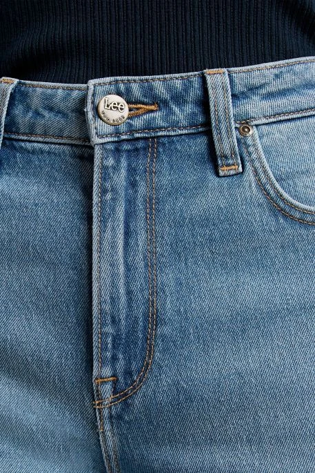 Jean Lee Carol pour femme. Jean taille haute, coupe droite de la cuisse à la cheville, coupe courte (au dessus de la cheville). Fermeture par bouton et braguette zippée.