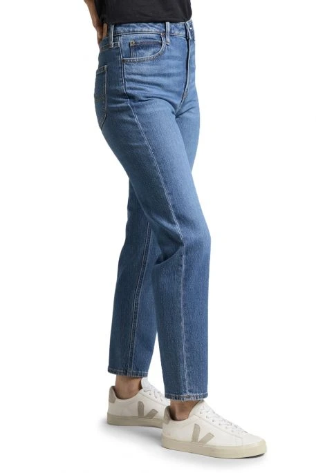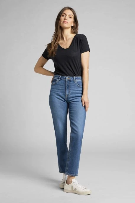 Jean Lee Carol pour femme. Jean taille haute, coupe droite de la cuisse à la cheville, coupe courte (au dessus de la cheville). Fermeture par bouton et braguette zippée. Couleur vintage inspirée des années 90.