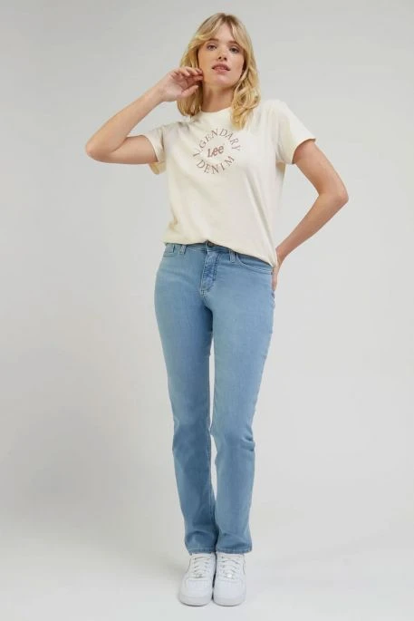 Jean Lee Ultra Lux Comfort Straight pour femme. Jean de coupe droite, taille mi-hauten jambe droite ajustée, fermeture par bouton et braguette zippée. Modèle 5 poches.