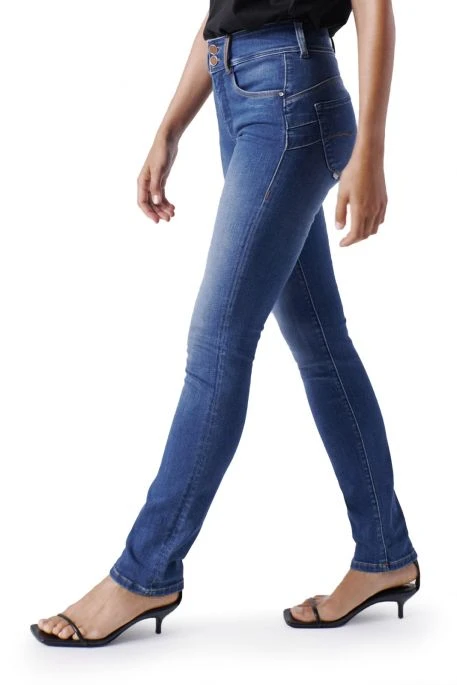 Jean Salsa Secret Push In Slim pour femme. Jean de coupe slim du bassin jusqu’aux chevilles, taille haute. Effet push-in, gainant (ventre plat) et légèrement push-up à l’arrière. Fermeture par 2 boutons et braguette zippée