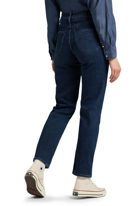 Jean Lee Carol pour femme. Jean taille haute, coupe droite de la cuisse à la cheville, coupe courte (au dessus de la cheville). Fermeture par bouton et braguette zippée.
