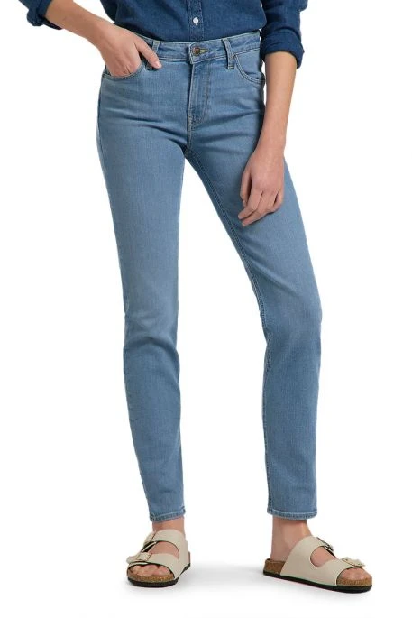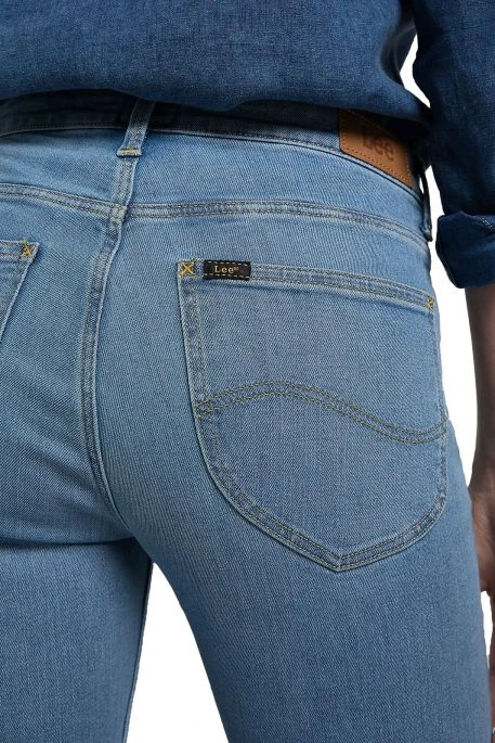 Jean Lee Elly pour femme. Jean de coupe slim sans ĂȘtre skinny, hauteur de taille intermĂ©diaire, fermeture bouton et braguette zippĂ©e. Patch LeeÂź en cuir Ă lâarriĂšre.