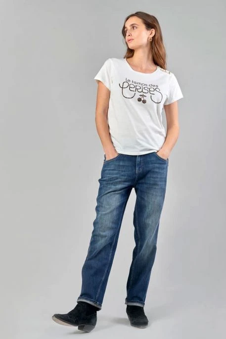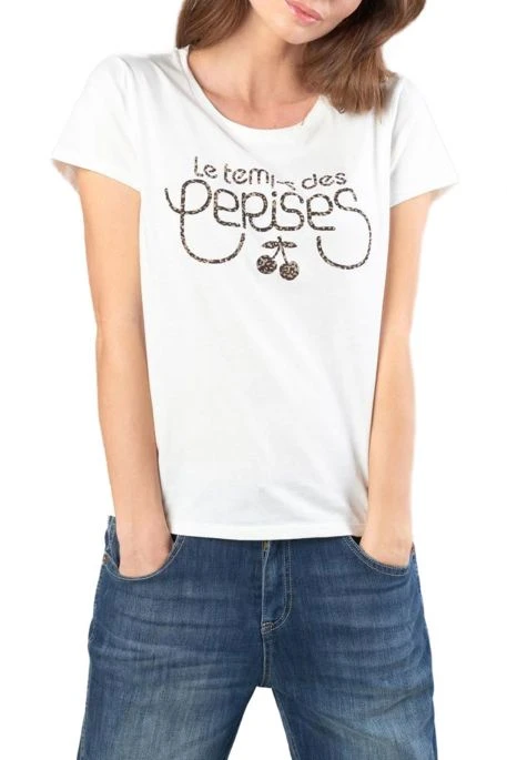 Tee Shirt manches courtes de marque TDC, T-S Carole avec imprimé personalisé » Le Temps des Cerises « , encolure ronde, ce tee shirt est orné de 3 jolis boutons dorés sur l’épaule gauche.