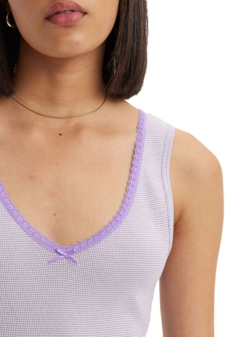 Débardeur Levi’s® pour femme, encolure en V, coupe ajsutée, débardeur avec un ourlet roulotté à effet ondulé, une bordure en dentelle et un petit nœud au milieur du col.