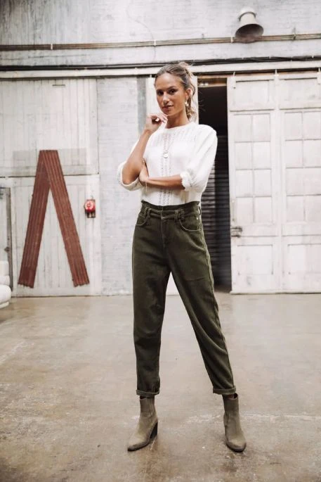 Pantalon velours de marque Freeman Porter, coupe boyfriend, taille haute, joli velours vert Forest, un confort inégalé pour ce pantalon Freeman !