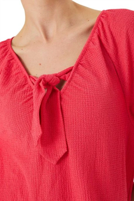 Robe Garcia Bright pour femme. Robe à manches courtes avec élastiques à la base, coupe classique, col en V avec noeud.