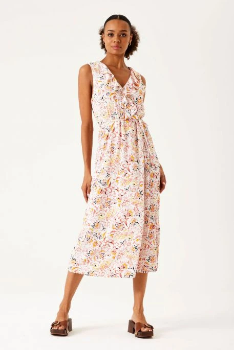 Robe Garcia portefeuille. Robe portefeuille à volants, coupe classique, sans manches, col en V. Cette robe se ferme avec une ceinture et un bouton pression. Tissu intégralement imprimé.