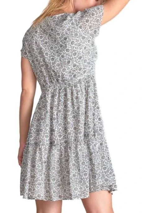 Robe Le Temps des Cerises Chardon, robe courte TDC avec un joli motif fantaisie, encolure en V, taille élastiquée à l’arrière, fermeture sur toute la longueur par des petits boutons, la robe est doublée et le bas est volanté.