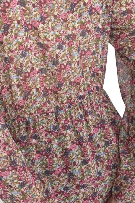 Robe Temps des Cerises à manches longues, robe avec col tailleur, épaulettes, motif fleuri, fermeture zippée invisible sur le côté, la taille est marquée,