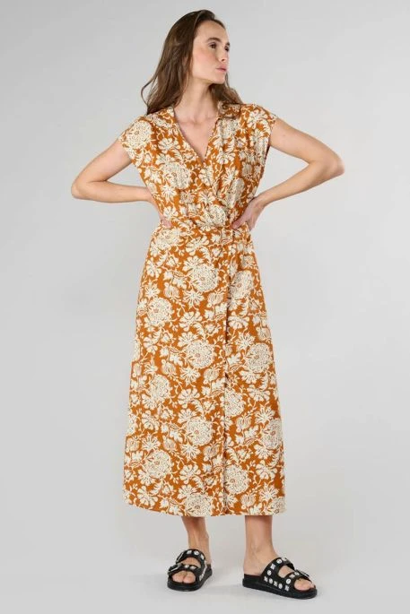 Robe Le Temps des Cerises Jourbab à motif fleuri, robe longue, robe portefeuille TDC avec col cache-coeur, bouton pression au niveau de l’encolure.
