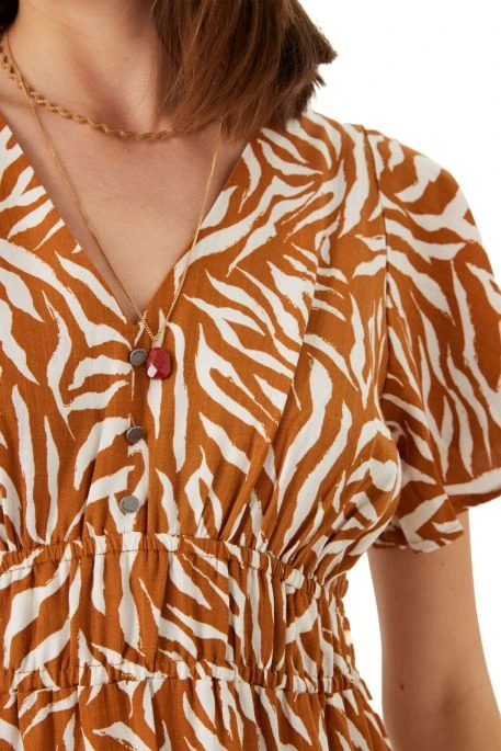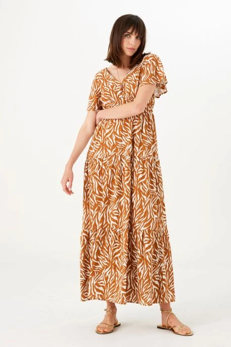 Robe longue Garcia. Robe longue avec volants aux manches et élastiquée sous la poitrine, col V et fermeture boutonnée devant. Imprimé animalier et coupe vaporeuse.