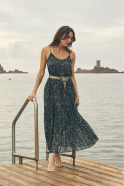 Robe longue Temps des Cerises, la robe Orient TDC a une coupe longue, une encolure en V, des manches courtes, le tissu en modal est fluide et très agréable à porter.
