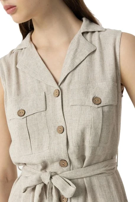 Robe Tiffosi Favo sable, robe mi longue avec fermeture boutonnée, encolure en V avec col, ceinture à nouer, deux poches poitrine boutonnée.fentes lattérales