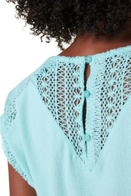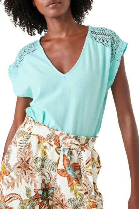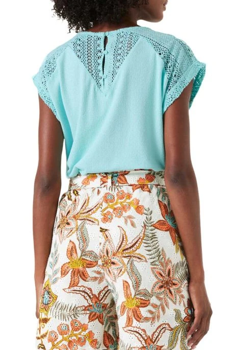 T-shirt pour femme Garcia. Tee shirt manches courtes brodé aux épaules et sur la manches et en V dans le dos, col V, boutonné dans le dos par 3 boutons, coupe droite.