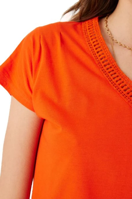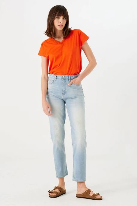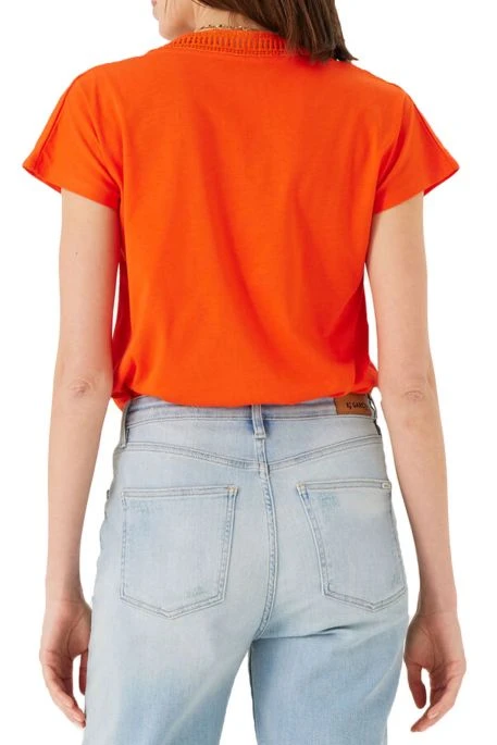 Tee-shirt Garcia Crocheté pour femme. T-shirt à manches courtes, coupe droite, col en V. Bord dur col avec détail crocheté.