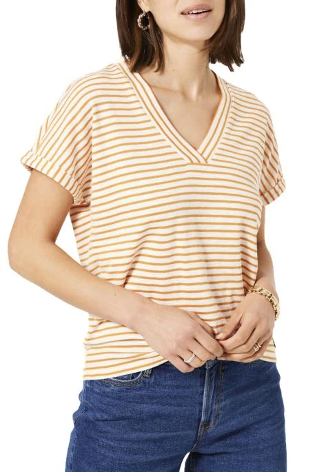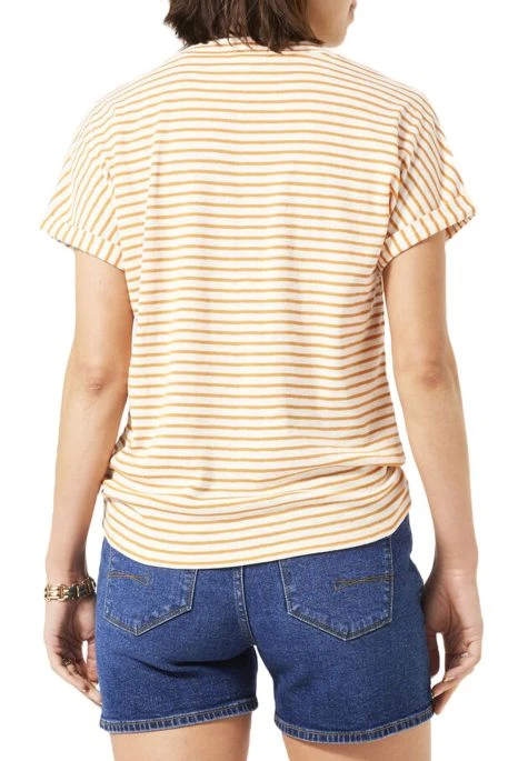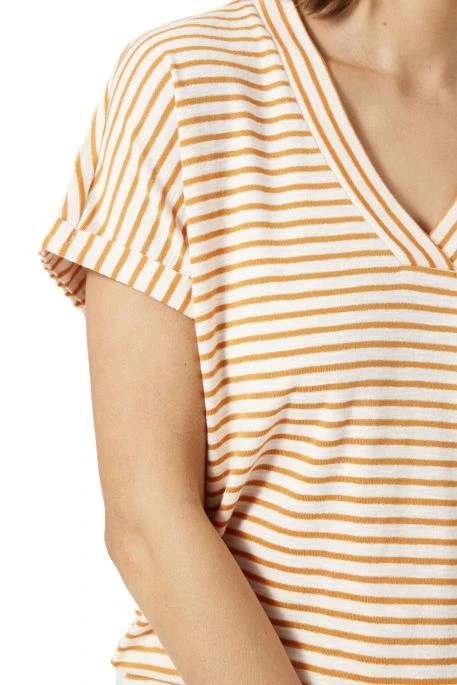 Tee Shirt Garcia pour femme, tee shirt manches courtes avec encolure en V, tee shirt rayé avec fils métalliques.