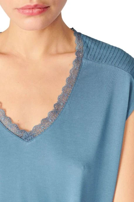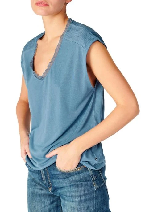 /Tee-shirt Le Temps des Cerises pour femme. Tee-shirt Ă manches courtes avec surpiqures au niveau des Ă©paules. Col en V habillĂ© d’une fine dentelle. Coupe droite.