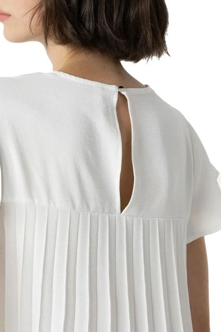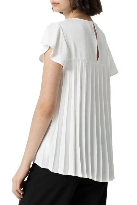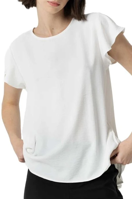 Ce top arbore une encolure ronde qui s’attache par un bouton , des manches à volants, le dos est plissé.