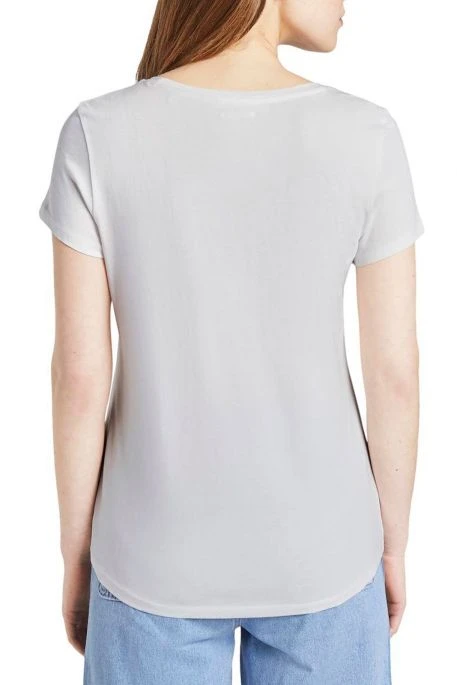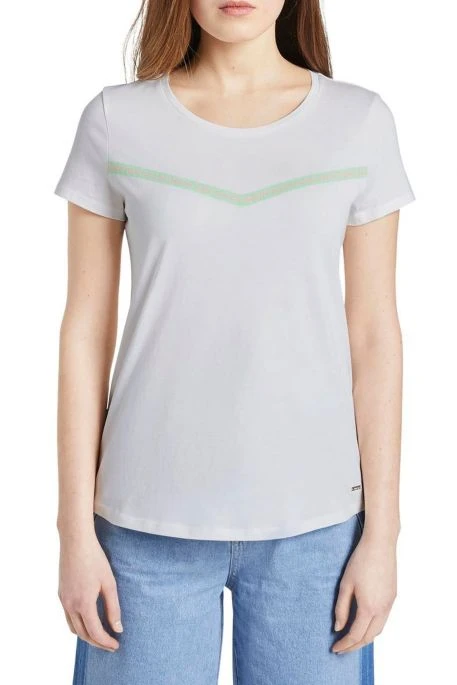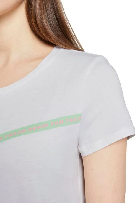 Tee Shirt Tom Tailor pour femme, manches courtes, avec coupe ample, avec un logo sur le côté de l’ourlet, inscription Tom Tailor Denim sur le devant