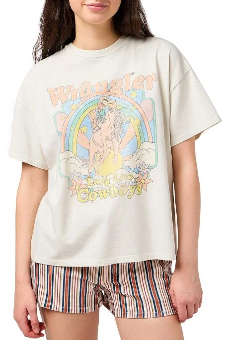 Tee Shirt Wrangler Girlfriend, tee shirt manches courtes, encolure ronde, coupe décontractée, motif central vintage, inscription de la marque Wrangler.