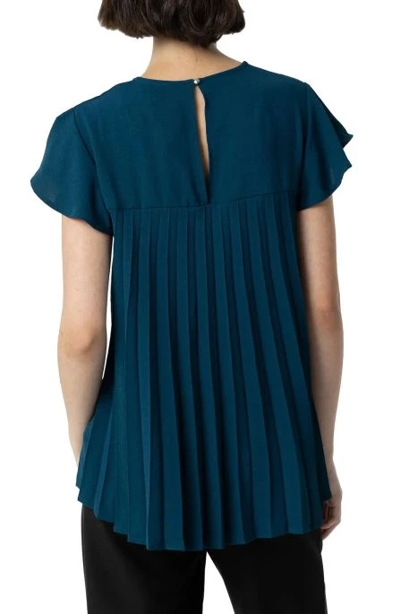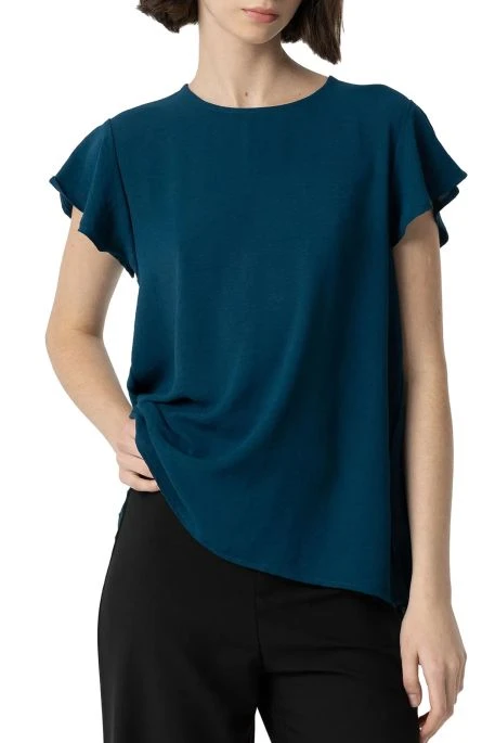 Ce top arbore une encolure ronde qui s’attache par un bouton , des manches Ă volants, le dos est plissĂ©.
